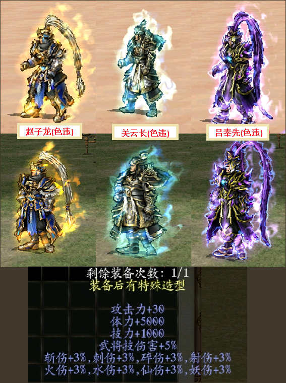 [活动奖励] 尊爵名将扮装宝盒(色违) (可自选以下一项:赵子龙(色违)【无】、关云长(色违)【无】、吕奉先(色违)【无】、赵子龙(色违)【卫无】、关云长(色违)【卫无】、吕奉先(色违)【卫无】)